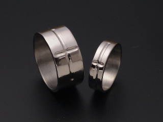 素材: 総チタン(外側つや消し) titan band の応用バージョン。デザインのアレンジは無限にできます。 幅8.0ミリ&10.0ミリ 内側とクロスの色はカーボン仕上げまたはチタン地色またはブルー。クロスの彫りと内側の色は同一色にてご指定可能。部分的に別色に手加工も承ります。 チタンの色はいったん全体に色処理をして残す部分以外を磨き取ります。 cross titan band の応用バージョン。デザインは無限にあります。 幅10.0ミリ&5.0ミリ 7mmを超えると2割増し 右画像はチタン地色 下の画像はラインがブルーで外はつや消し仕上げ リングと幅の選択について* 10mm幅という幅はかなり幅広ですので1年中を通してフィット感を得ながら着け続けるには難易度の高いサイズとなります。冬と夏でも朝と夜でもひとによってサイズが変化するために、幅の広い指輪程、体調を如実に反映します。 サイズについての詳しい記述をお読みください。 ライン加工1本につき¥16500