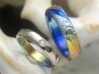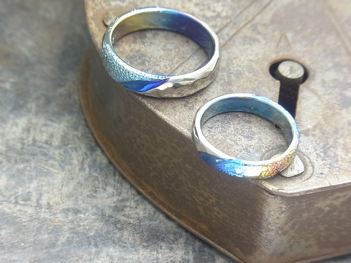 3点のウエーヴをつけ、ハンマー痕を残した純チタンリング。幅をそれぞれ変えてオーダーメイド