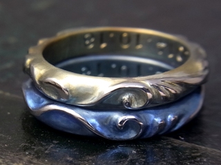 リング幅わずか3mmの中に唐草模様の浮き彫りを表現し、イニシャルやハートを入れてあります。